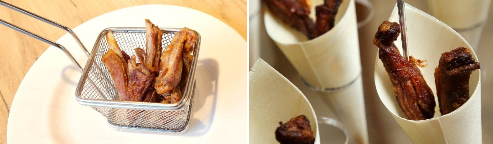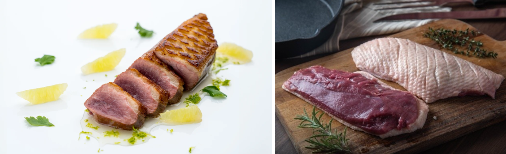 Pato: destaca por su sabor intenso y su carne jugosa, especialmente en piezas como el magret. Es ideal para técnicas que combinan cocciones rápidas y elaboraciones más sofisticadas, como tatakis o confits.