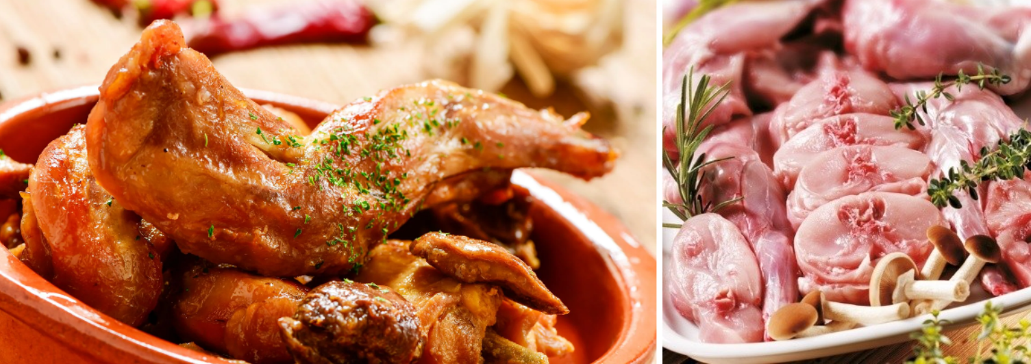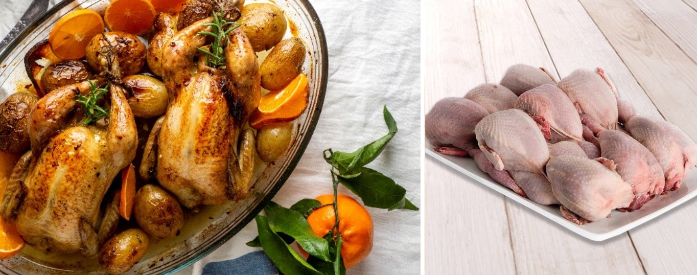 Codorniz: es una carne de sabor delicado y textura tierna. Su tamaño compacto la convierte en un producto versátil para entrantes o platos principales con una presentación elegante.