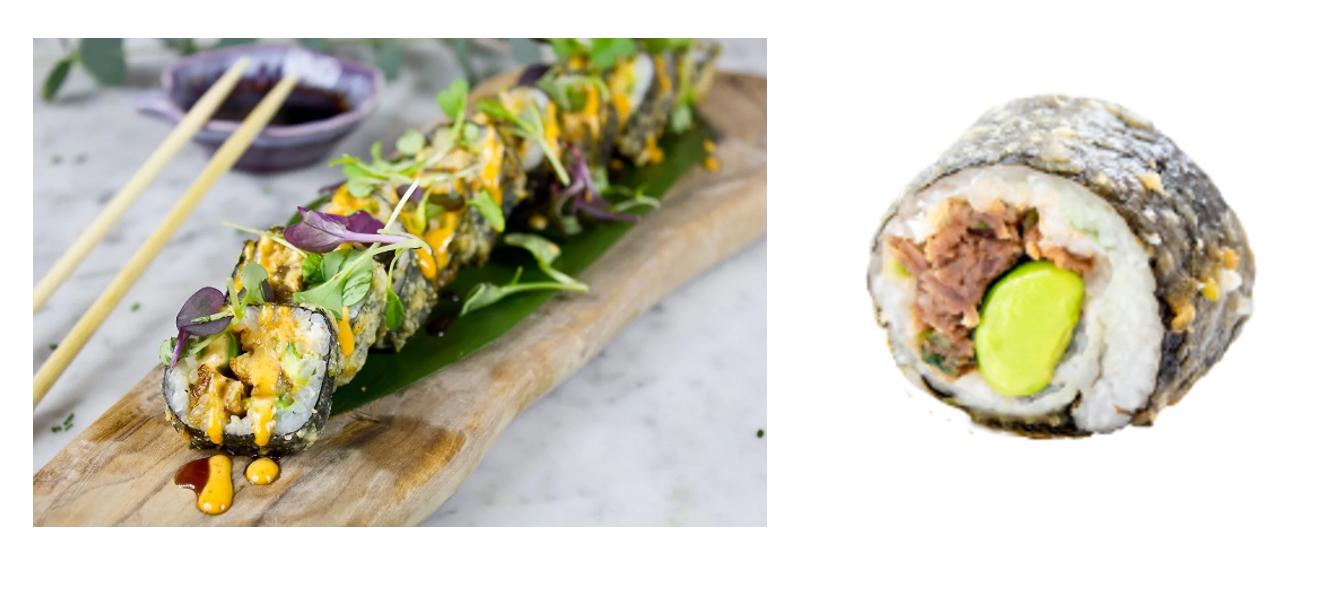 Hosomaki pato edamame y salsa Hoisin: también disponemos de sushi, cada vez más solicitado en celebraciones y eventos navideños. Los formatos de sushi se están convirtiendo en una apuesta moderna y atractiva para menús contemporáneos.
